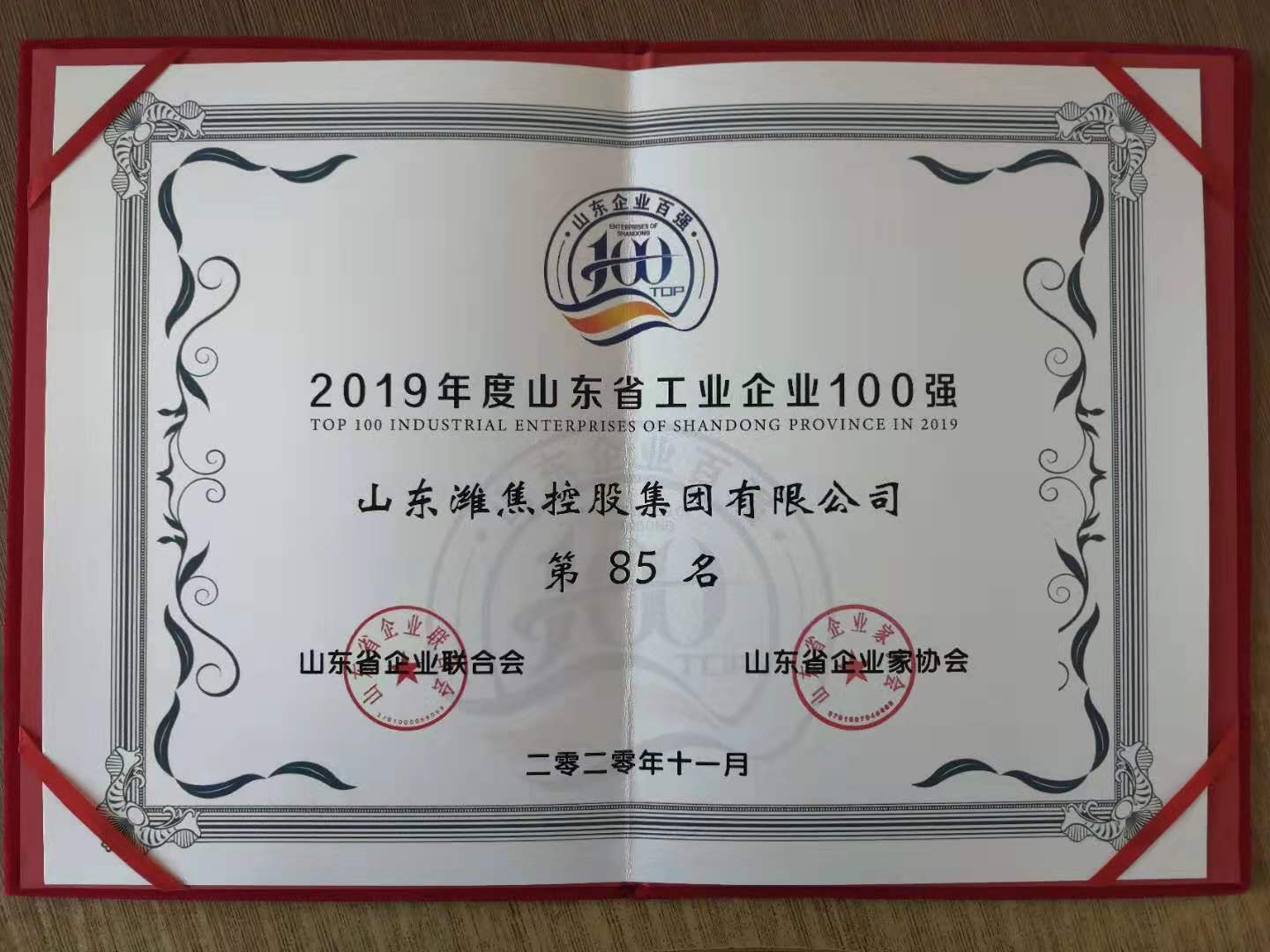 11月11日,山東省工業和信息化廳、山東省企業聯合會聯合發布了2019年山東省綜合百強和工業百強名單,山東濰焦控股集團有限公司榮登山東省工業百強企業榜單,位列第85位。